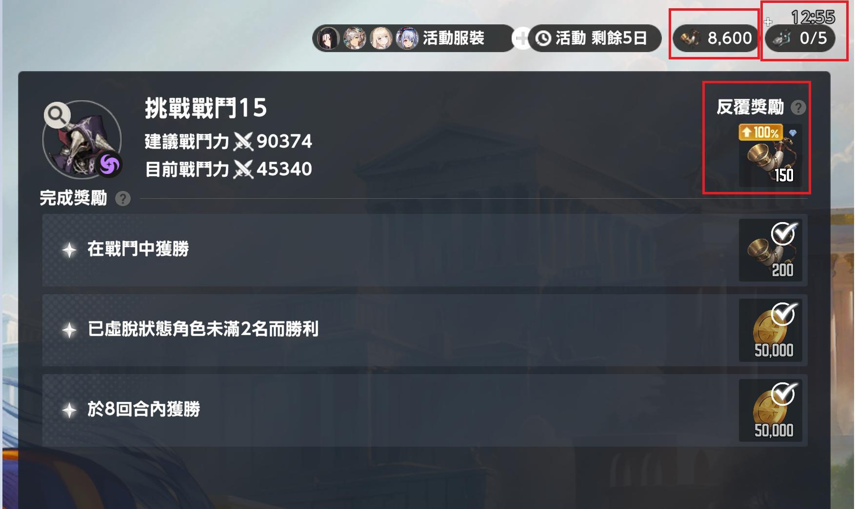 每天免費5張AP券都有打完(條件:要能打得贏挑戰LV15,且活動服裝加成100%)