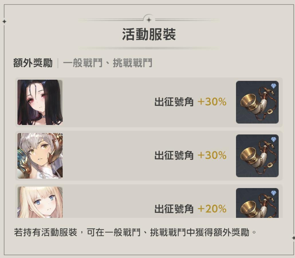 ● 黃色的100%數字代表活動服裝加成(每期有不同的活動服裝來增加獎勵)